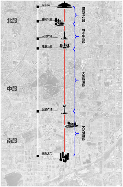 人民大街是長春市貫穿南北的中軸線,北起長春站站前廣場,南至南四環(huán)。根據(jù)道路建設歷史、兩側用地功能及建設風貌特色,可劃分為4大特色區(qū)段——滿鐵文化段、城市中心段、大型院落段、文化金融段。