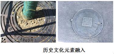滿鐵文化段結合偽滿建筑、近代歷史特色局部采用暖色調(diào)鋪裝,其他段融入文化元素自行車道上檢查井蓋采用具有文化標識的鑄鐵井蓋,用年代軸線來呈現(xiàn)人民大街的歷史,融入人民大街“百年長街”文化元素。