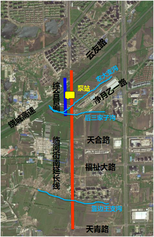 臨河街南延長(zhǎng)線工程位于長(zhǎng)春市南關(guān)區(qū),北起臨河街既有路南端(和美路),南止天青路,道路跨越南關(guān)區(qū)與凈月區(qū),途中穿越繞城高速、農(nóng)大支溝、后三家子溝、靠邊王支溝,道路設(shè)計(jì)車速40km/h,道路全長(zhǎng)2839.919米,為通向凈月區(qū)域內(nèi)南北方向次干路。