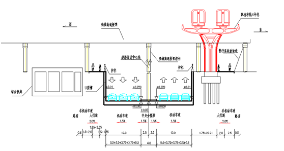 泵站布設(shè)于樁號(hào)0+560西側(cè)慢行系統(tǒng)位置,在保證泵站與西側(cè)管廊作業(yè)面的條件下,布置泵站、分流池布設(shè)在慢行系統(tǒng)下,泵站檢修孔采用隱形井蓋布設(shè)人行方磚,通氣口及變壓器布置在紅線外,保證慢行系統(tǒng)連通。