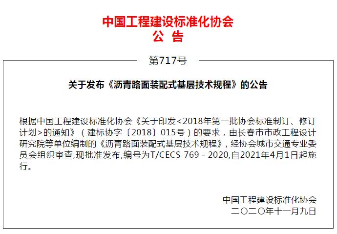 我院主編的中國工程建設標準化協(xié)會標準《瀝青路面裝配式基層技術規(guī)程》今日發(fā)布,2021年4月1日起施行,適用于全國市政道路建設。