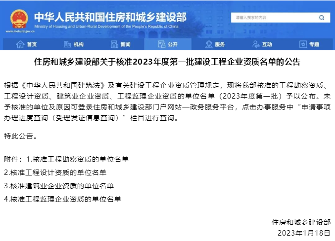 2023年1月18日,住房和城鄉(xiāng)建設(shè)部公布了關(guān)于核準(zhǔn)2023年度第一批建設(shè)工程企業(yè)資質(zhì)名單的公告。長(zhǎng)春市市政工程設(shè)計(jì)研究院有限責(zé)任公司獲批市政(燃?xì)夤こ?、軌道交通工程除外)行業(yè)甲級(jí)資質(zhì)。此項(xiàng)資質(zhì)在吉林省范圍內(nèi)共4家企業(yè)擁有,我公司位列其中。